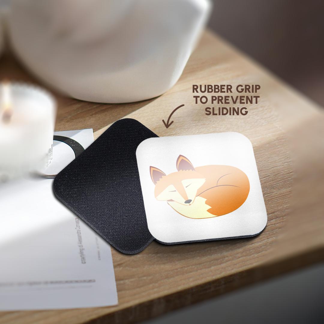 Cute Sleeping Red Fox Coaster is a great complement to any home décor. Soft coasters are 3.5" x 3.5", are absorbent, and can be washed. Ceramic coasters are 4.25" x 4.25", non absorbent and come with felt corner pads. Available in sets of 4 and 8.